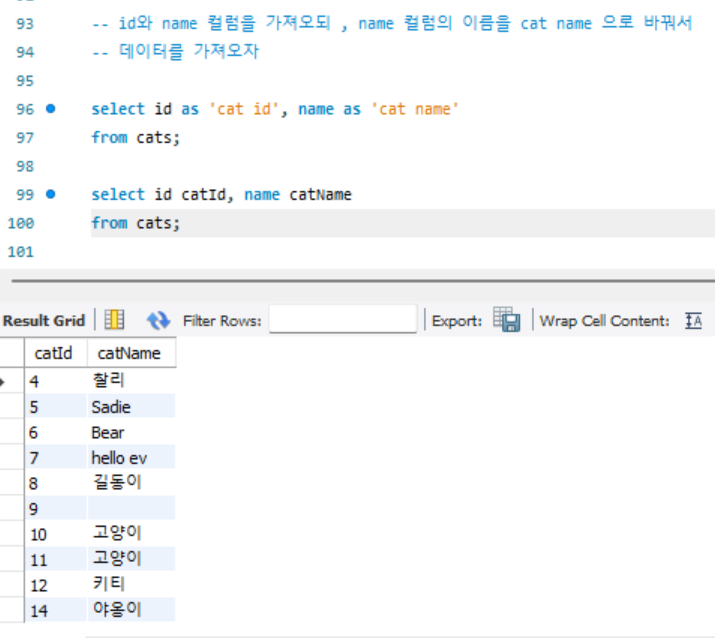 -- id와 name 컬럼을 가져오되 , name 컬럼의 이름을 cat name 으로 바꿔서