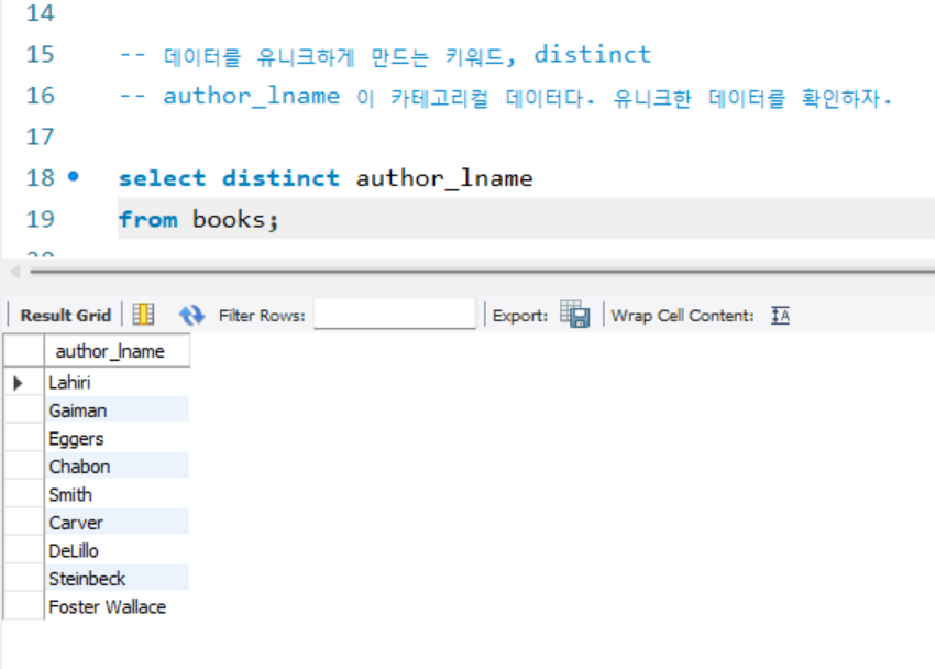 select 옆에 distinct 를 기입해주고 원하는 컬럼명을 넣어줍시다.