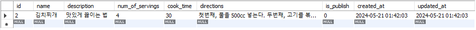 get_connection()함수를 호출하여 데이터베이스에 연결합니다. - 쿼리문 작성: 레시피 데이터를 삽입하는 SQL